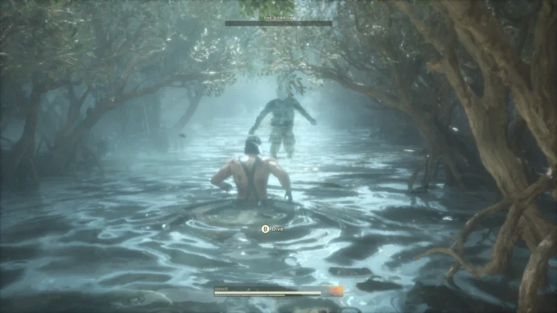 Die Boss-Kämpfe sind ebenfalls gleich geblieben, kamen mir hier nur ein wenig schwerer vor. Und kaum ein Spiel hat solch gut durchdachten Bosse wie die Metal Gear Solid Reihe, speziell dieser Teil. Der Kampf mit dem legendären Scharfschützen The End geht über vier Zonen und besteht vor allem aus Tarnung, Gegner finden, anpirschen – The End ist schon sehr alt und man kann sogar kampflos gewinnen, denn seine STAMINA wird von alleine weniger. Dies braucht allerdings einige Zeit und so ist der normale Weg schon zu bevorzugen. Auch The Sorrow ist ein Kampf der besonderen Art, denn dieser ist mehr eine Art Walking Simulator – am Ende sterben wir ohne Wenn und Aber – und man muss erstmal drauf kommen, wie man dies rückgängig machen kann.